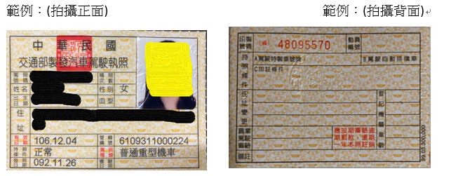 🌈臨時沒帶到機車駕照解決辦法2:請家裡的人拍攝承租者本人的機車駕照,格式如下範例,請依照以下範例拍攝標準正反面勿反光遮蔽到任一駕照資訊,傳送至本公司官方@Line。