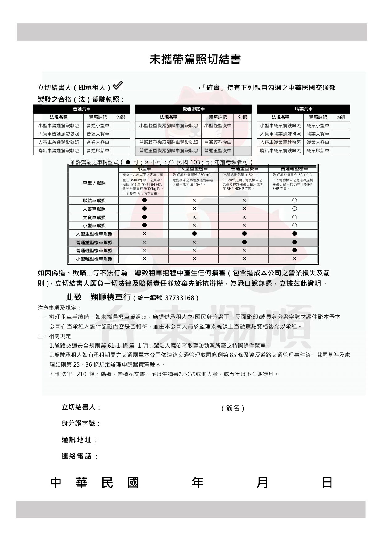 🌈台東租機車沒帶機車駕照解決辦法1:本公司會先線上查詢駕駛人考取過機車駕照有駕駛資格(以及駕照無記點註銷)後,承租者需提供身分證影印並現場簽名"未帶機車駕照切結書"後即可承租。