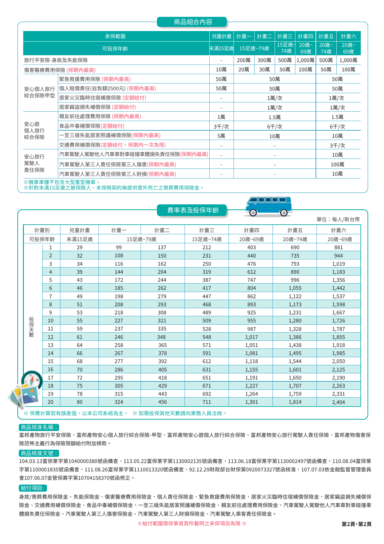 - 註:計畫五以上才有【第三人責任險及第三人財損】、保單內容以及金額以當年度保險實際出單為主,本保單DM僅提供顧客閱讀費率方案。