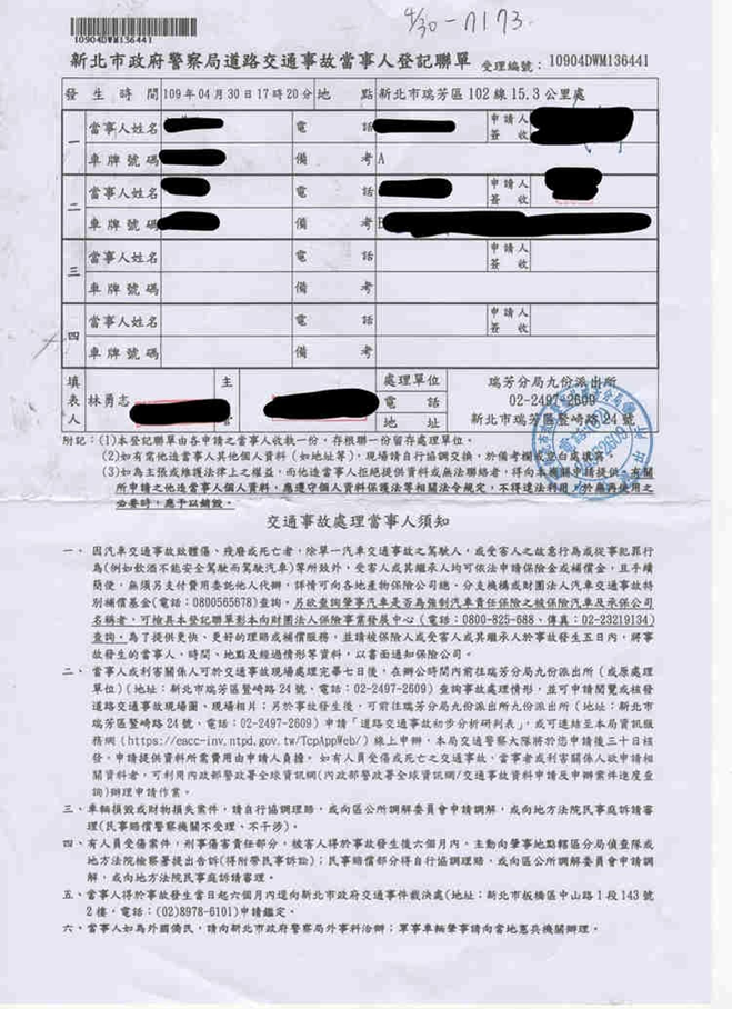· 員警到場後會做量測與標註,結束後會開立事故三聯單給雙方,記得一定要索取。另外,可以向到場處理的員警詢問一些基本個人資料,方便日後確認。