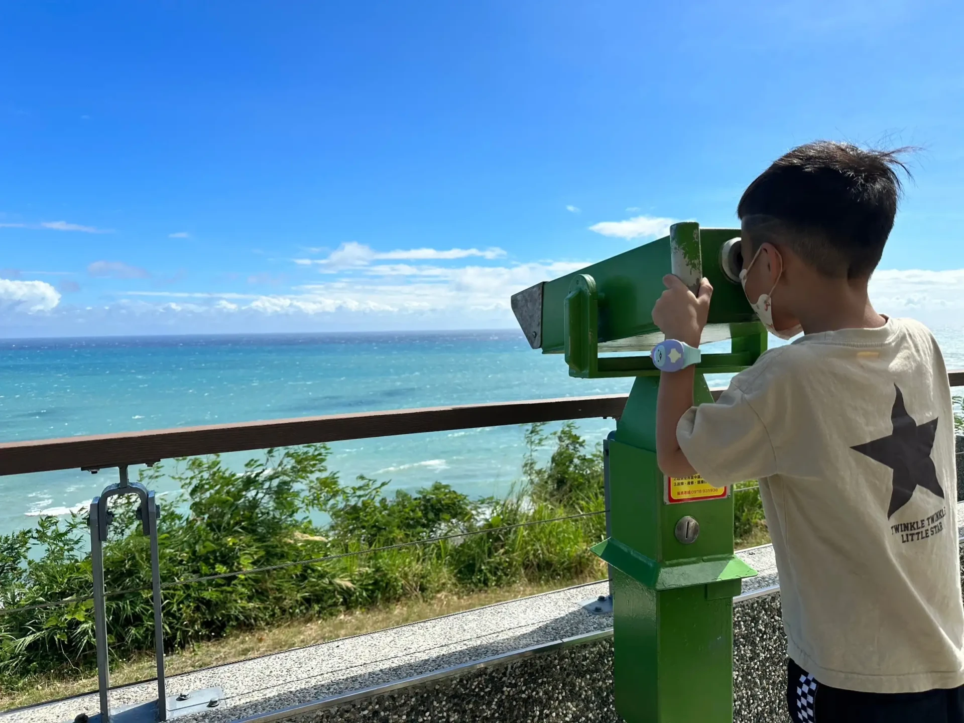 觀賞海景五星級休憩點就在這裡!可以停下機車,看著漸層色的台東專屬藍天和大海,這是台灣北部和西部沒有的絕佳漸層藍色海景。投幣10元讓小朋友可以開心的用望遠鏡去觀察遠方海洋的美,你說!這邊是不是真的很美呢?歡迎你們經過這裡停留下來拍照跟我說呦