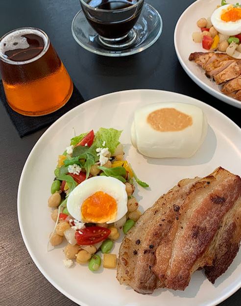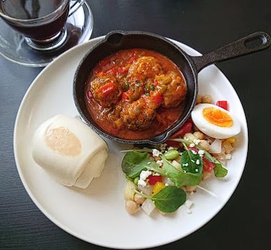 ⭐⭐⭐⭐⭐手拍荖葉肉丸佐椒紅醬印象還滿深刻的,肉丸本身和醬都好吃,饅頭是初鹿的牛奶饅頭,有淡淡的奶香,很好吃,而且可以續加一次,沾著椒紅醬很優秀。嫩煎雞胸肉,不會太乾,味道也算乾淨,好吃。沙拉也都滿乾淨清爽好吃的,水煮蛋熟度也剛好,搭配起來很棒,早午餐會有附優格,也不錯吃。煙燻厚切培根,厚度很讚,煙燻味吃起來很加分,不會過多,原本以為會偏油,但實際吃起來不會,喜歡吃培根的人一定會很愛。鷹嘴豆泥佐口袋餅,比較少見的早午餐,搭配pita還滿清爽好吃的。