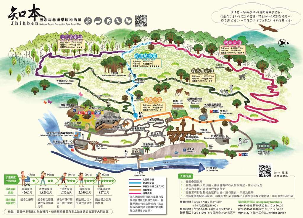 園區內有五條森林步道可挑戰,觀景步道:適合小朋友、年長者行走的輕鬆步道。好漢坡步道: 是考驗體力、耐力最佳選擇之一,但請量力而為,身體不適、或有心血管疾病、高血壓或心臟病等病史者切勿嘗試。森林浴步道: 沉浸在樟樹林及大葉桃花心木林等林木中,步道平緩能輕鬆完成。七里香步道: 是一條保留自然景觀,融合環境設計風格,以手作職人精神打造的步道。榕蔭步道: 輕鬆步行時間約1.5小時,可從各個角度遠眺知本溫泉區。必逛的特色景觀與園內設施: 花見知本百草園、季風穿林區、水流腳底按摩步道。下午16:50準備關閉,請於17:00之前離開遊樂區。景觀步道有條件開放寵物入園申請(僅限已打晶片之犬貓)