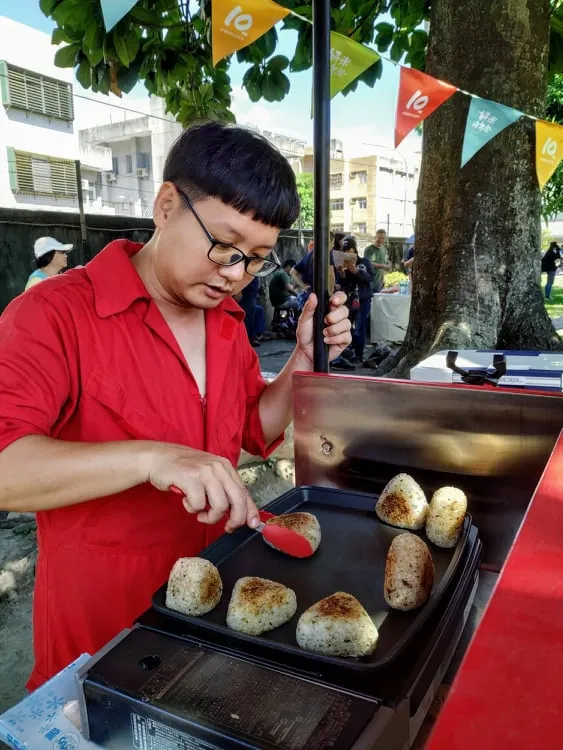 糰長老闆的自介:台東胖大叔販售高顏值烤飯糰,口味少、動作慢易手忙腳亂,堅持採用台東好米、手捏不用模具