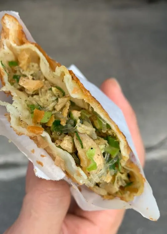 內餡飽滿有豆乾、蛋、韭菜、冬粉,因蔥油餅的餅皮是現桿現做,需等候一下時間唷。