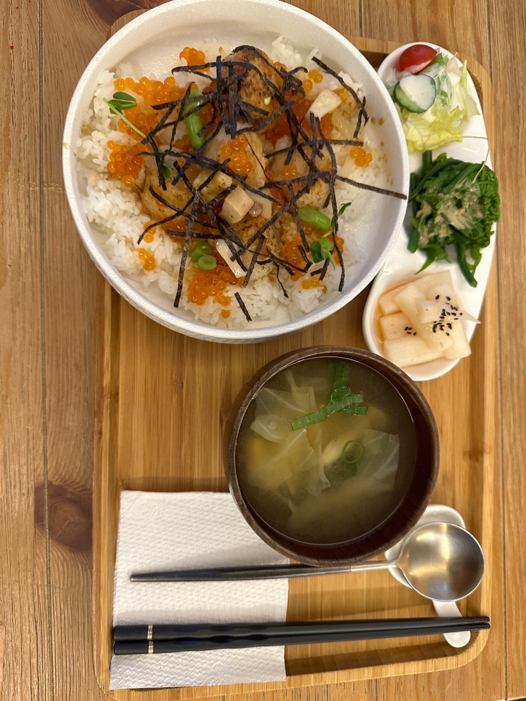 ⭐⭐⭐⭐⭐2023/04/30 16:26 名不虛傳 五星好評可以換馬卡龍 但就算沒有送東西我也會給五星 唯一值得挑剔的是飯量吧 不過後來加點一碗白飯就解決了 干貝鮭魚卵丼飯 跟 香煎櫻桃鴨胸 真的是非常精緻美味 飯煮的恰到好處 很久沒吃到這麼完美的白飯了! 干貝鮭魚卵飯上的 五顆生食級(我推測的)干貝真的巨 鮭魚卵也是不客氣的給 小菜也很用心 櫻桃鴨胸滑嫩可口 配上烤過的甜椒+杏鮑菇串 還有整根的青龍椒,灑上蔥&乾辣椒絲 配色上無懈可擊啊! 附帶一提 店內聘請的員工都很機靈 一看沒水馬上補 我吃到一半入內想加點白飯一碗 內場人員一看前台忙碌馬上出來支援 知道我的需求後立即告知會先幫我添飯 我只需要耐心排隊等付款 細節種種看的出員工訓練有素👍