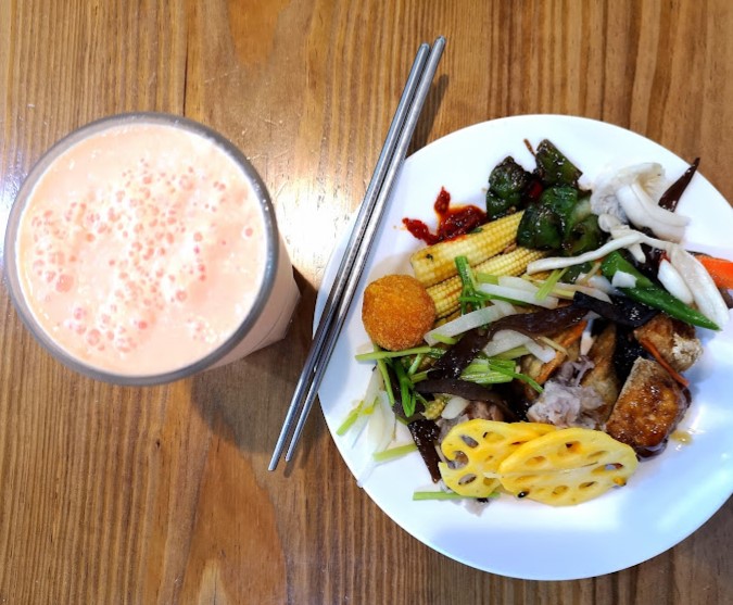 ⭐⭐⭐⭐⭐南瓜蒸蛋太好吃了。嚐起來是用鮮菇高湯做的,沒有一絲蛋腥味。有蔬果的清香、有蕈菇的鮮味,又有滿滿蛋白質的飽足。蒸南瓜綿密甘甜;蒸芋頭丁也是綿香且不乾澀;枸杞毛豆調味得宜;青花菜、高麗菜、地瓜葉、不確定是不是野莧菜的菜也都是各具風味、柔嫩而不軟爛;原本有點吃不慣的百香蓮藕,後來也是愛上它爽脆的口感、酸甜的滋味。菇類都很好吃,滷花生小方豆乾也很入味。