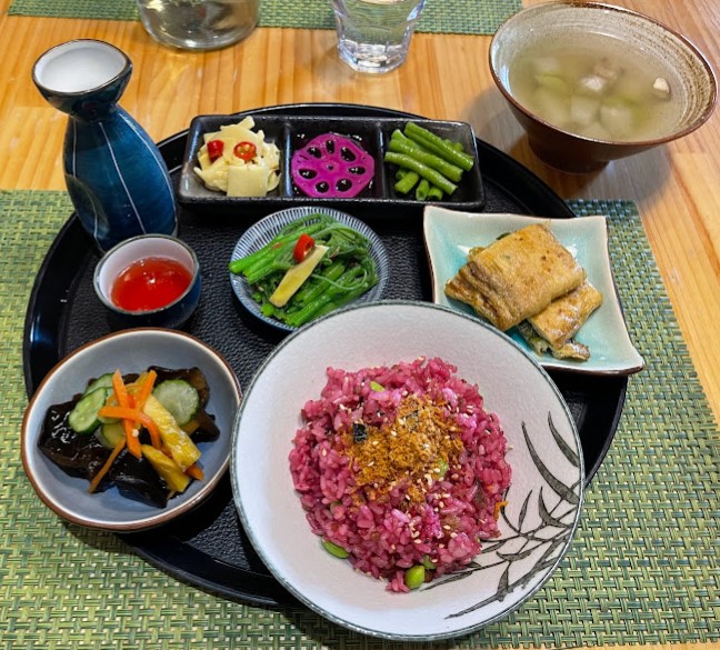 ⭐⭐⭐⭐⭐無菜單料理需預訂,若無訂位則是單點菜單。 本來有點害怕挑食的我到蔬食餐點無法適應,想不到雖然健康但風味卻讓人十分驚豔。 提供了沙拉、前菜、湯品、主餐、飲料和甜點。 沙拉的水果和生菜十分新鮮,不會有生澀的苦味。 前菜有花椰菜、豆乾和洛神花,整體表現很好,尤其是豆乾十分入味。 湯品是清爽的蔬菜加蛋的清湯,適合暖胃解膩。 主餐除了火龍果炒飯,還有提供幾道小菜、蔬菜和蘿蔔糕,其中蘿蔔糕令人驚豔~ 火龍果炒飯粒粒分明,搭上素鬆,讓人忍不住多吃幾口,直到現在還在回味~ 甜點是茶凍,飲料是熱騰騰的薑茶,也都吃得到食物的原味。 整間店靜靜的、慢悠悠的,讓人遺忘在都市的壓力和煩惱,坐下來,慢慢地、好好地享受一頓美味又健康的蔬食料理~